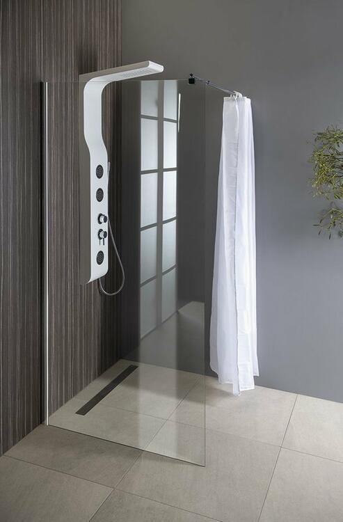 Jednodílná pevná zástěna typu Walk-in s výškou 190 cm určená pro instalaci na stěnu s chromovaným profilem a čirým sklem. Součástí balení je také teleskopická vzpěra s nastavitelnou délkou.