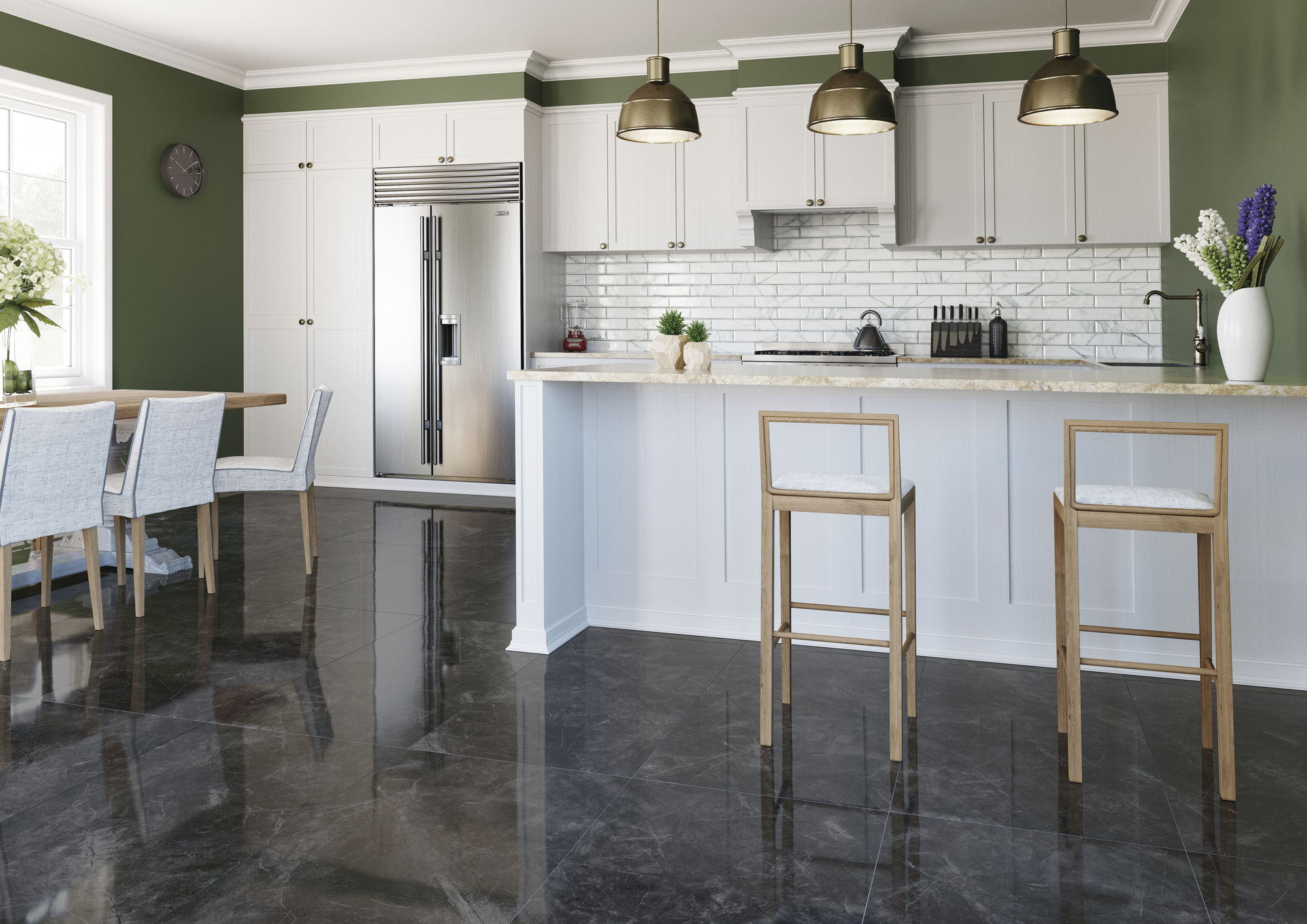 • Budete mít kuchyni v luxusním stylu? Jako obklad za kuchyňskou linku nebo jako dlažbu můžete zvolit třeba keramické imitace mramoru v bílé nebo v jiné barvě.