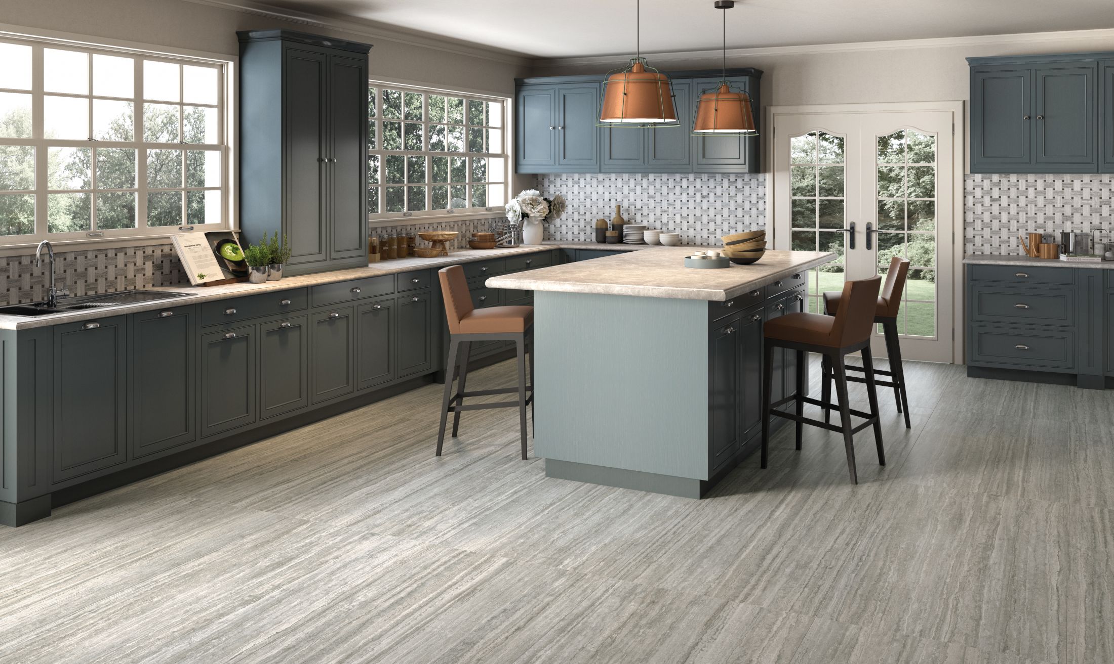 V kuchyni ve venkovském stylu budou hezky vypadat také dlažby v imitaci kamene neboněkteré imitace kovových povrchů.