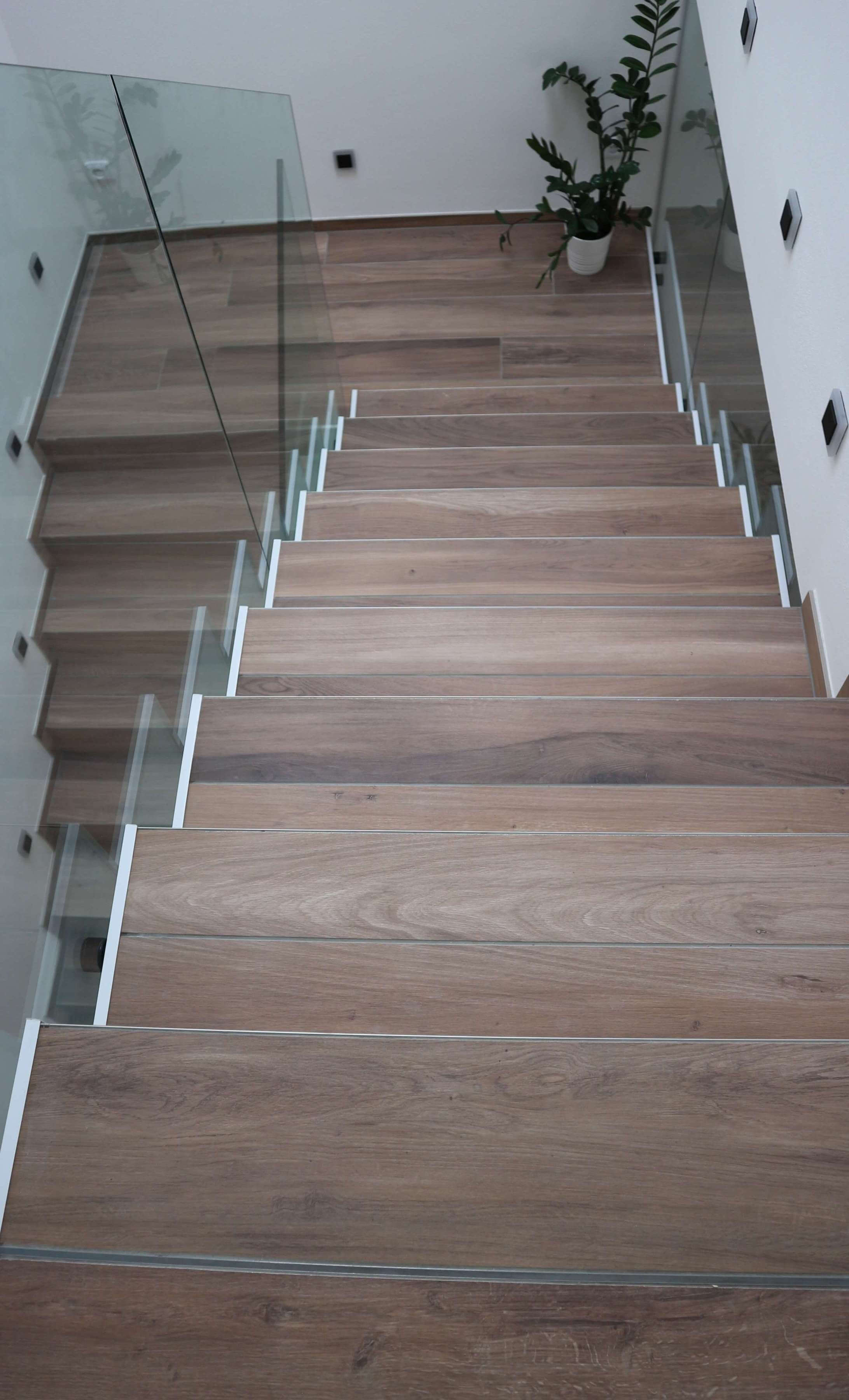 Lišt na schody je, samozřejmě, ještě mnohem více. Kontaktujte nás, rádi vám doporučíme to nejlepší řešení pro vaše schody. Níže se můžete inspirovat realizací schodů našeho zákazníka. Ten má na schodech dlažbu v imitaci dřeva, hrany schodů jsou ukončeny nerezovou lištou.