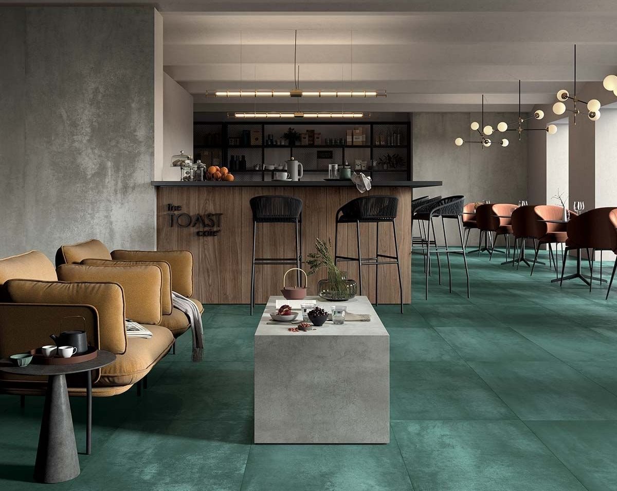 Dlažba v imitaci betonu Lemmy je mrazuvzdorná. Tato keramická imitace může mít nejen zelenou barvu, ale také třeba oranžovou, modrou nebo černou.